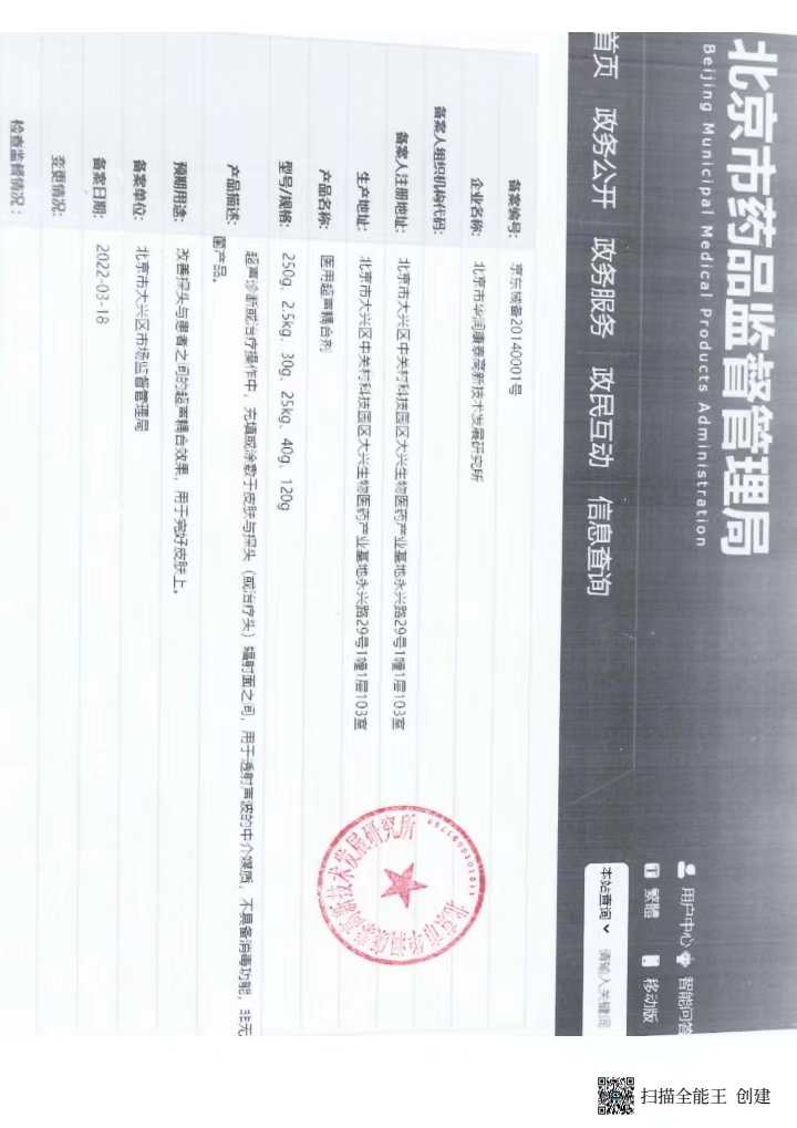 超診斷或治療操作中,充填或涂敷于皮膚與探頭(或治療頭)蝠時面之間,用于透時聲波的中介媒質(zhì),不具備消毒功能,非無 菌產(chǎn)品。